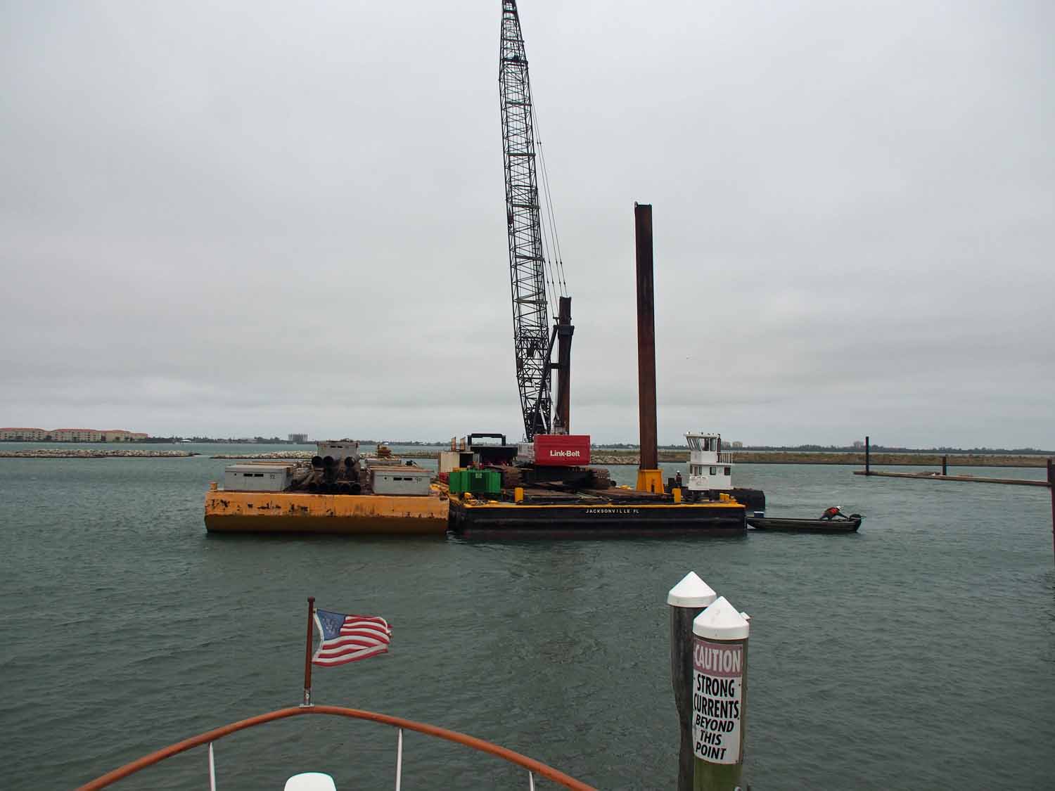 After pumping out and toping off our fuel at the Fort Pierce City Marina we just left the dock and had to stop, back up and retie as a construction barge for the new docks came in front of us. Once that was out of the way we took the scary channel out to the ICW. The channel isn’t so bad if you’re ready for it. It can have a very strong sideways current (the guy at the marina said up to 5 knots, but I think that’s stretching it a bit) that is OK if you’re ready for it. We’re told that some are not and get a good bash on the pilings or are swept out of the channel to run aground.