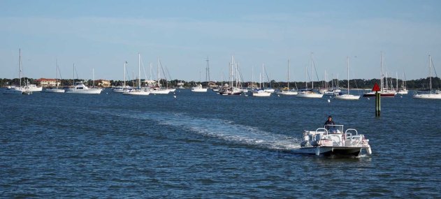 We’ve reached St Augustine and are on the south eastern most mooring ball in the mooring field just to the south of St Augustine Municipal marina. You can see this on Google maps, satellite view. Enter the marina name and just look at the dots on the water south and a little east. It was from the water taxi for this mooring field that captain Bill Slattum, our training captain, took the picture I started this blog with.