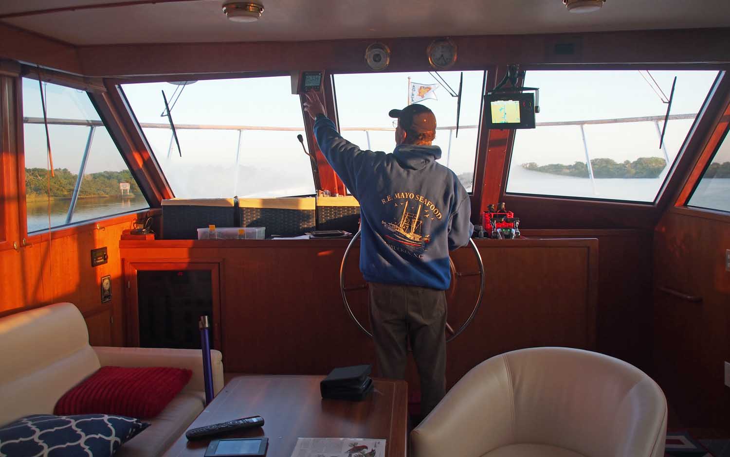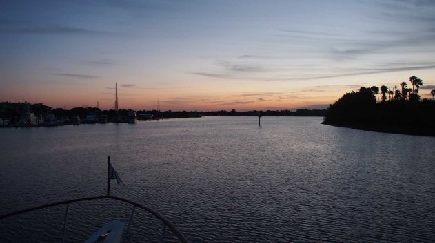 It was nice and sunny (once the sun came up) but quite cool for Florida when we started from New Smyrna Beach at 7 this morning. 67 was the high today. DeFever friends the Satterfields from Bella Mare, also just up from the rendezvous, helped us away the dock. We really appreciated the work Greg did to set up our downstairs drive station. Cozy no mater what weather outside. By 10 we were upstairs with all the isinglass closed. No wind that way and a bit of a greenhouse effect so we were comfortable there.