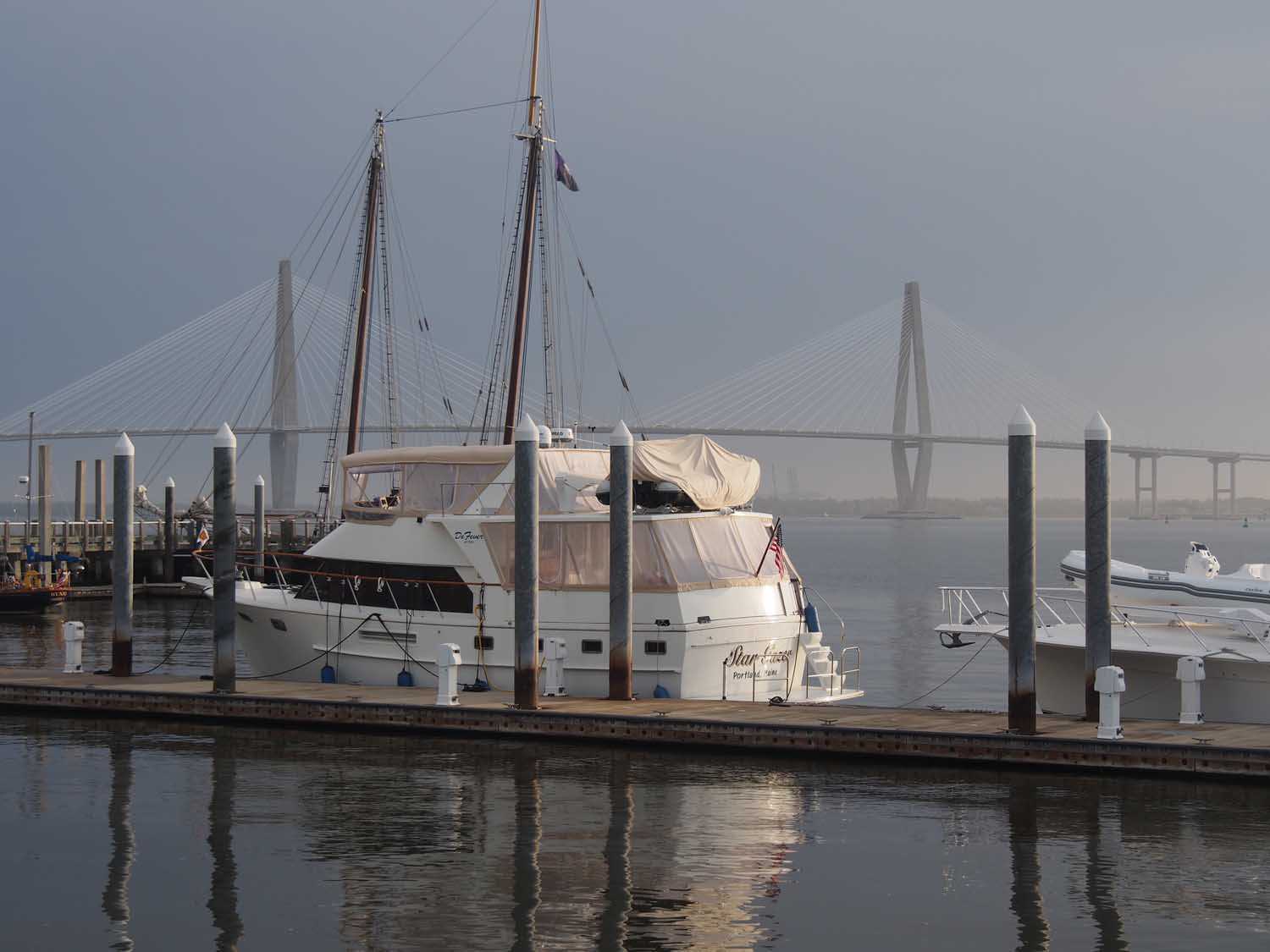 Charleston City Marina was full, so we went on around the peninsula to Charleston Maritime center on the other side. It’s a small marina only for transients. Not many boats here even though it’s high season for tourists in Charleston with normally very nice weather. They tell me it’s because they can’t take the really big boats and the tide changes make for pretty strong currents that take you to the edge of their small basin quickly if you don’t keep on top if it (and have both engine controls working).