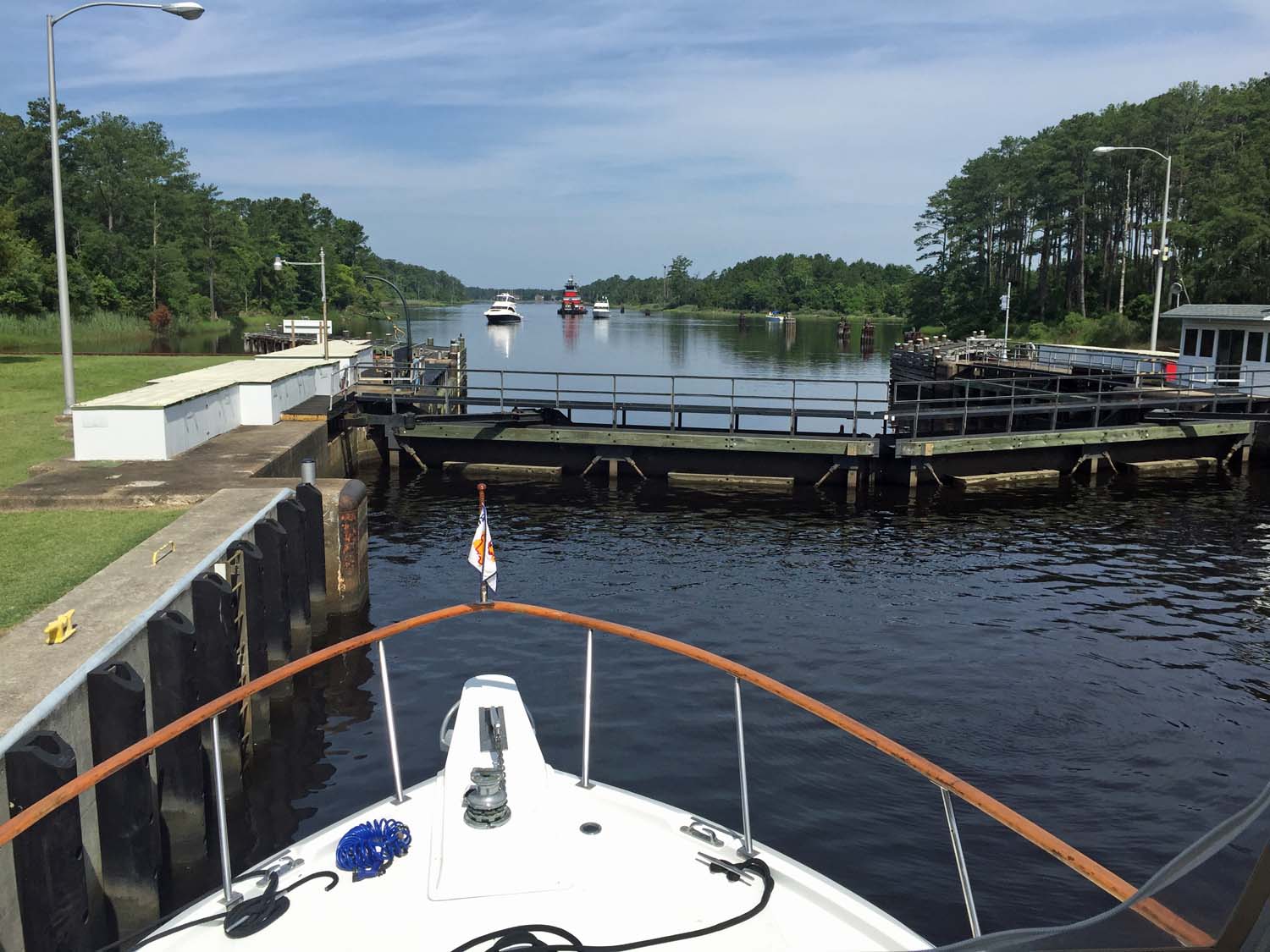 We hit the Great Bridge lock as it was open on our side so sailed right in to the front where we waited for more boats behind us. There were a big group of Coast Guard people at the lock who took the opportunity of all those boats being stopped to board everyone for a safety check. We had been checked less than a year ago but of course I could not find the paper from the previous boarding. They were a lot quicker than last time, when they traced all our plumbing. They were off us only a few minutes after the lock gates opened but still had to do the boats behind. The boats going the other way waiting to get in may not have been to happy about their delay.