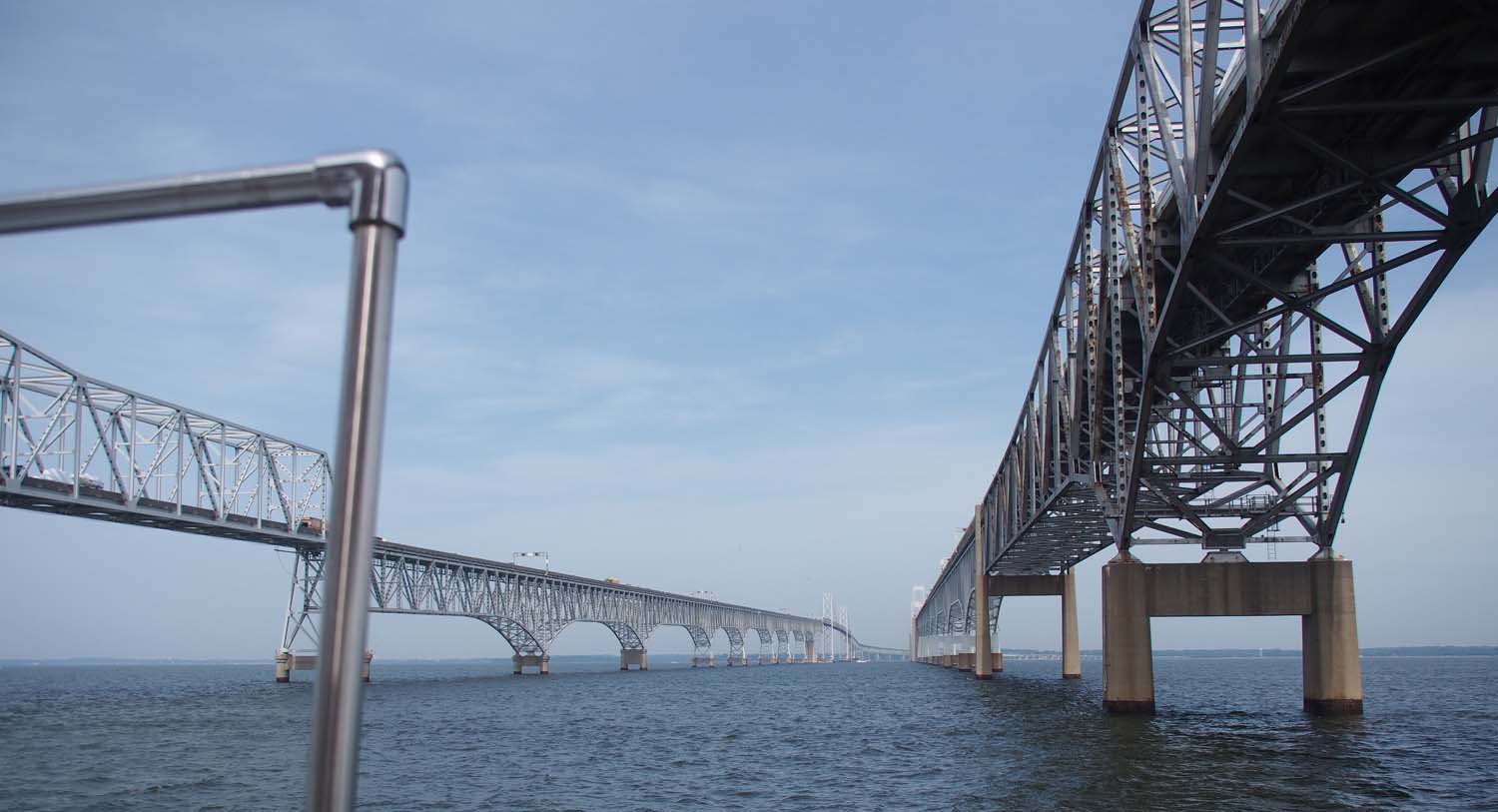 Long set of bridges crossing the bay. To the south bridges are partial. Traffic was in tunnels where we crossed.