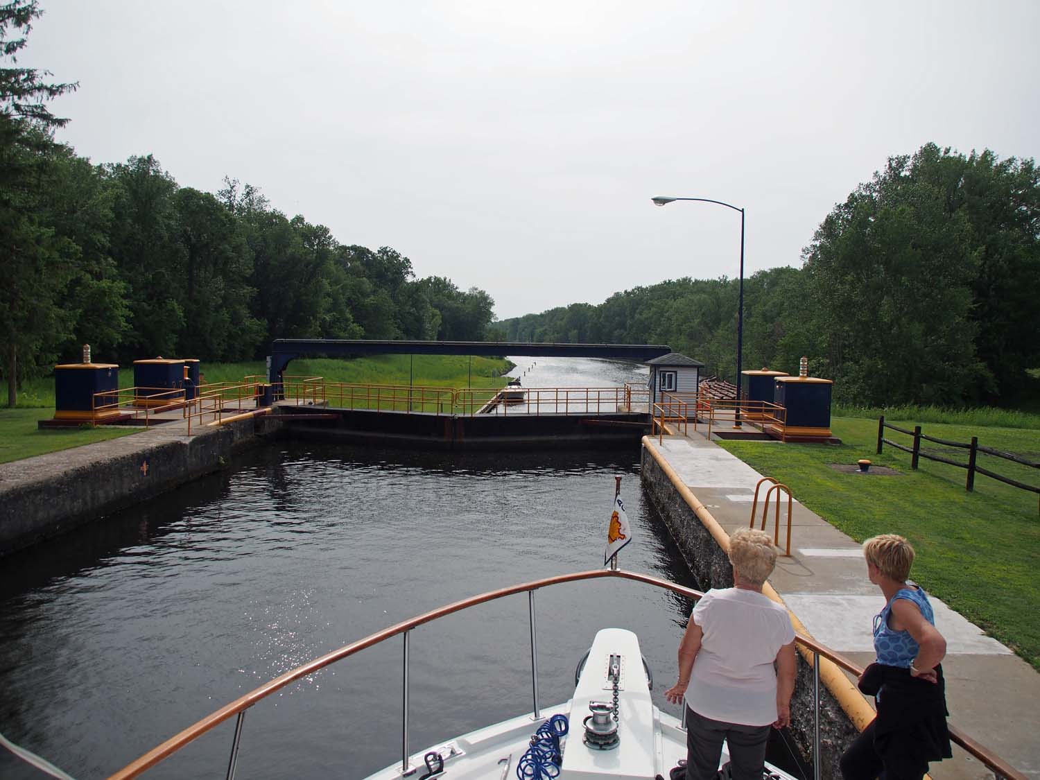 After crossing we entered the Oneida River. This had houses and docked boats along both sides, since we were on the northern edge of the Syracuse area. We slowed down on this portion and seemed to just glide along with little noise or impact on the water. There was only one lock, down with no drama.