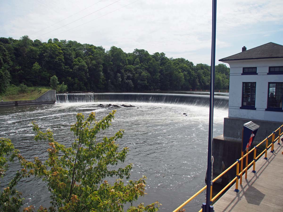 Today’s 25 mile trip on the Oswego canal took us through seven locks, all down to Lake Ontario’s level. Locking down is almost always without turbulence, but lock O3 was an exception. There is a power house and dam just left of the entrance, and with high water in this section of the canal water was running off to the left something fierce. I could see turbulence welling up throughout the area before the dam and powerhouse and it came right up to where we were. I turned to the right and countered it pretty well, but then headed too far right as we entered the lock, corrected and headed too far left, right toward the left wall.