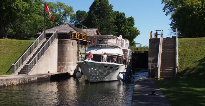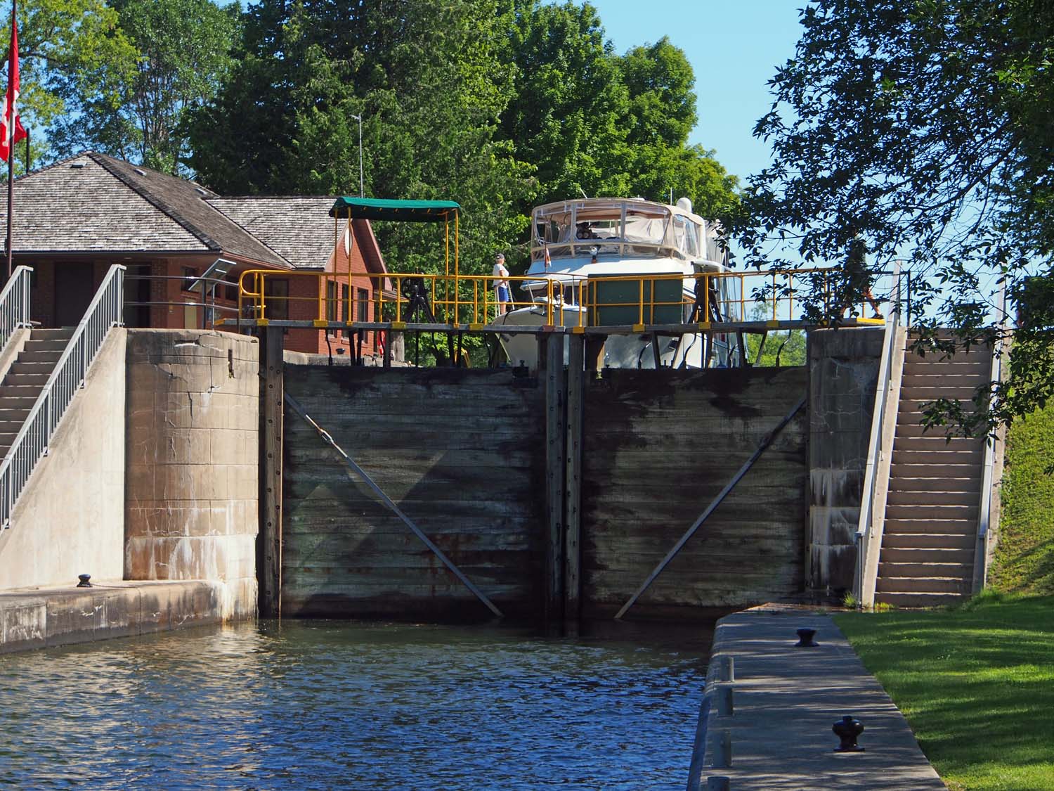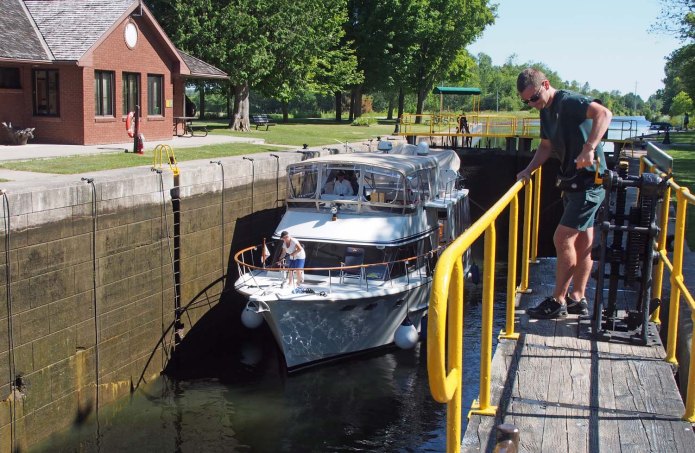 Since the locks open at 9 and we stayed on top of lock 38, we started later than usual today. We passed through locks 38 through 41, altogether covering only 2 ½ miles, after which we entered Lake Simcoe. We have been locking down since the Kirkfield lift lock (36), so our highest navigation was between locks 35 and 36 in Balsam Lake at 841 feet. We locked up from Lake Ontario at 243 feet. We’ll go back down to the Georgian Bay, part of Lake Huron at 581 feet.