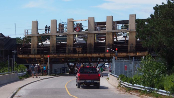 The carriage took us up out of the water, across a road and then down the hill for an overall drop of 60 feet. We stood up on the bow, looking down the hill for quite a ride. On exiting Big Chute, a Securite call was immediately made to warn oncoming boats of our impending passage through the narrow fast current Little Chute channel. With the strong following current we could not stop for an oncoming boat. There was no answer so we passed without incident and soon came to the last lock in the system, the rather normal lock 45.
