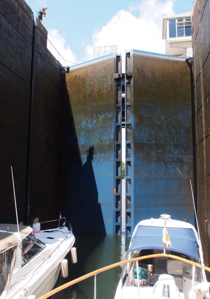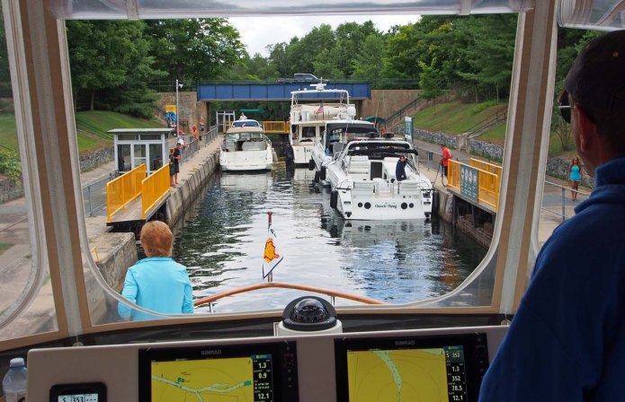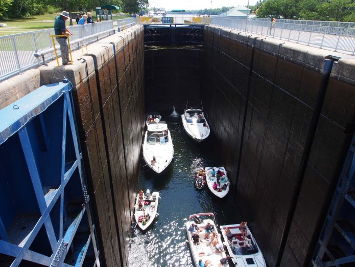 Our last day on the canal, between Lake Simcoe and the Georgian Bay, was maybe our most active. At Orillia we were told this would be the busiest part of the canal system. At Bobcaygeon they told us that was the busiest part, so I’ll just say that today we travelled a busy part. Today, Saturday, was the first day of a three day holiday weekend. The weather was pretty good, which meant a whole lot of boaters were out. Our first lock, 42, opened at 9 and was about an hour away. There would probably be a lot of boaters parked overnight on the blue line that would want to go through first, so we left at 8:30 hoping to make the 2nd or 3rd batch. When we got there the lock appeared full, but the green light remained on, so we squeezed into the last slot, beside a narrower boat. We two back boats were each just a few feet from the back gate.