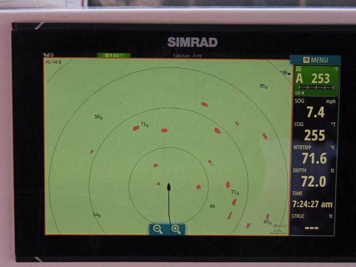 Boats going to fish on Sunday passed ours in the dark before we left. We saw them our first few miles out. Notice near the bottom that I changed course to keep us and our wake further from other boats. Each circle is .5 miles out.