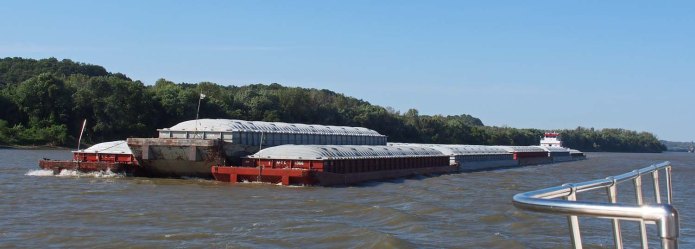 There was no obvious place to stay between Havana and Alton. At first I thought about tying up at the LaGrange Lock 58 miles from Tall Timber. They sometimes have barges above where boaters can tie up, or allow anchoring in the area below the dam. I called them and found that there were no tie up places above and the currents below were too strong for anchoring. A couple of times along the way we saw barges on the bank where we might tie up. We called a nearby towboat and asked about one and found we could use it but would be thrown off at 6 AM when it was to be loaded. The second time we found a candidate its company did not allow tying up.