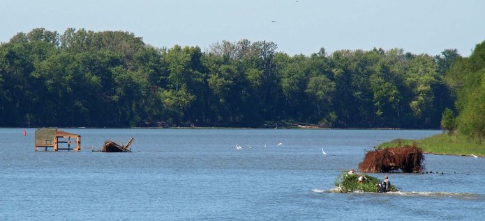 We saw structures that appeared to be duck hunting blinds. These people are supplying the cover for one of them.