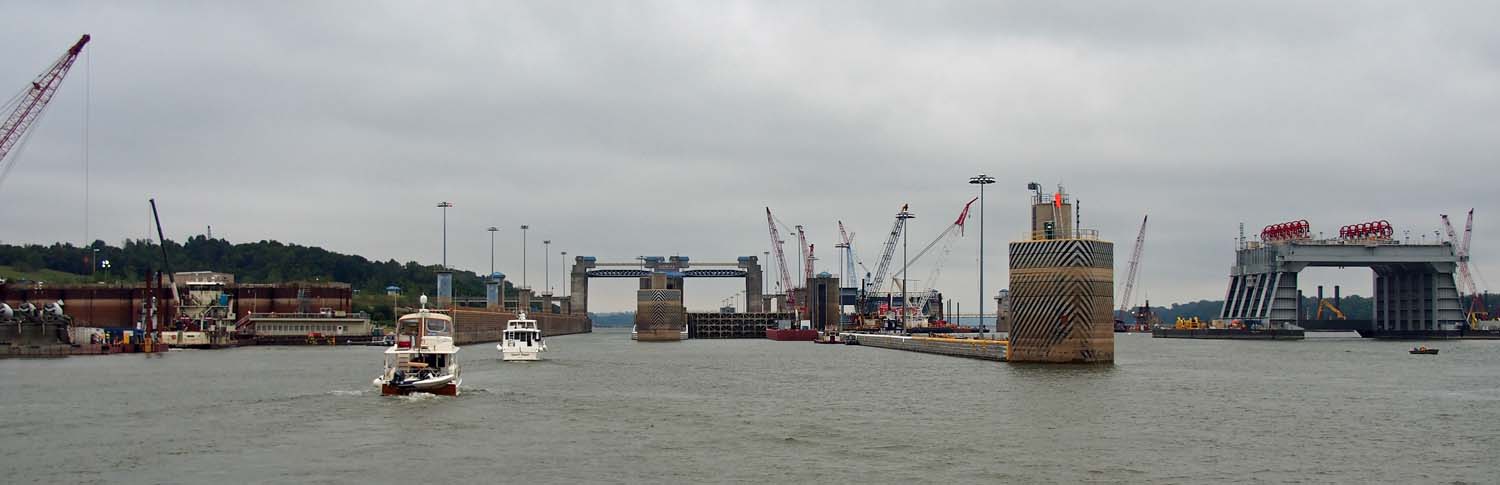 The Olmsted lock and dam are still under construction. The dam is not complete and is not blocking water flow, but except for one of the very large new lock chambers passage is blocked by the construction. Its gates stay open and everything going either way has to go through it. No passing in the lock or its approaches. We still had to wait half an hour until we were directed through.