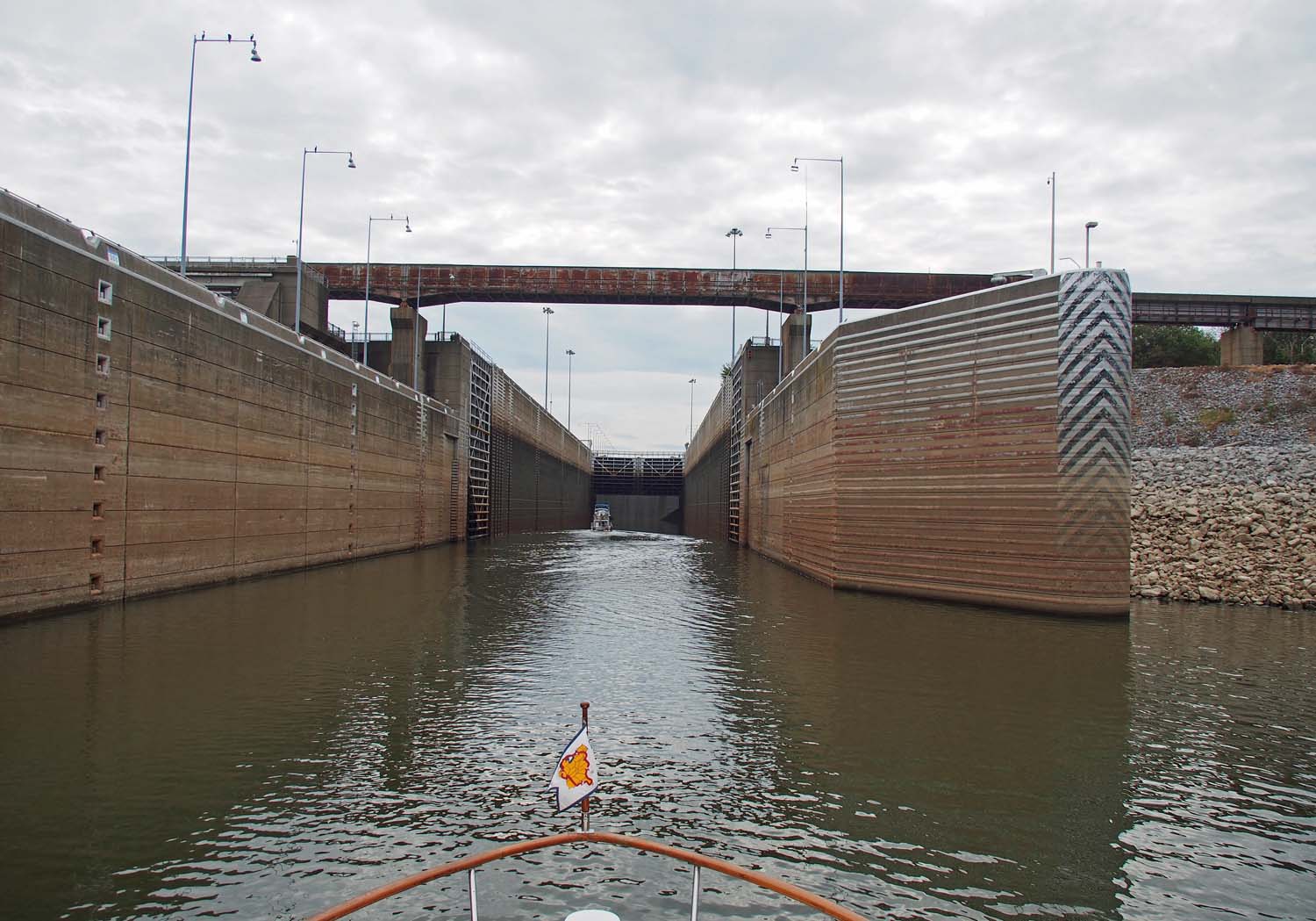 Near the end of our trip we hit the Barkley lock which was just opening its doors for a houseboat ahead. We locked up 57 feet and turned into Green Turtle Bay Marina only a half mile further on. It is in the very small village of Grand Rivers KY between the large Barkley and Kentucky lakes.