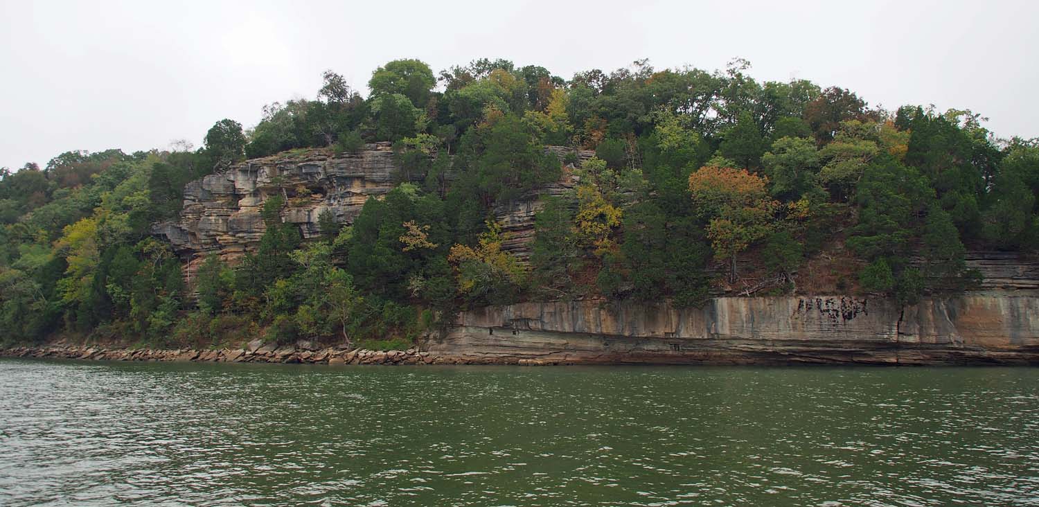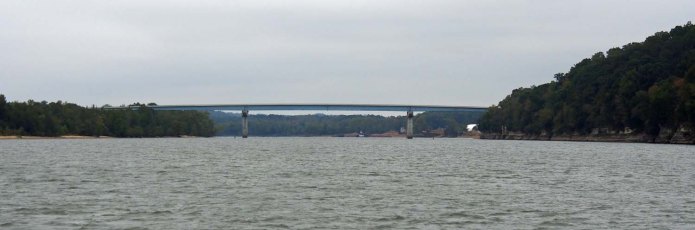 It was cold and overcast as we left Pebble Isle Marina after staying two nights. With a predicted high of 65 we decided, for the third time in our boat traveling history, to drive from below all day. We ran the genset so we could run the AC in heat mode and were very comfortable. We soon came to the end of the Kentucky Lake and were back on the Tennessee River, but it was wide with no traffic
