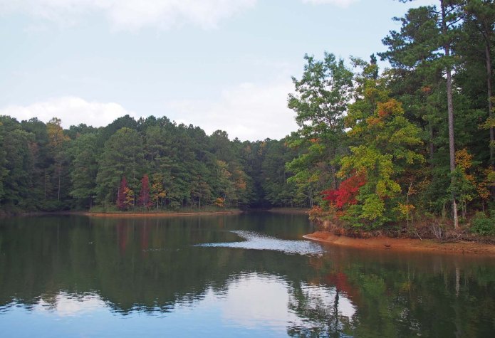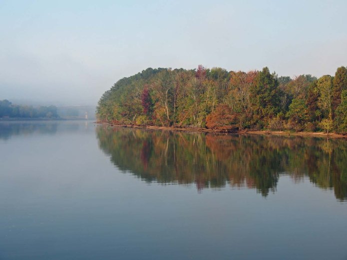 Our eventual destination is Midway Marina in Fulton MS 56 miles and three locks away, but today we went 36 miles and anchored before the first of the locks. Our anchorage is very nice and away from everything, including any cell phone access. No phone calls, no weather checking, nothing. Fall color is just starting here, but a few selected trees have turned, with some smaller ones provide a red accent color.