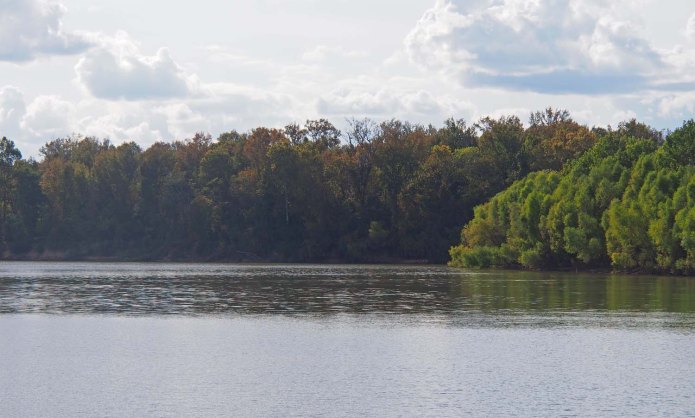 As we came out we saw Reunion with Dennis and Carol coming in the distance. They had anchored 20 miles upriver from us and had probably started at first light. We didn’t get off until about 9 with me working on some plumbing in the engine room. Not the first time we’ve seen them since we had lunch together in Demopolis. Our Okatuppa anchorage was a few miles upstream from Coffeeville, the last lock on the Tombigbee, so we locked down together with them.