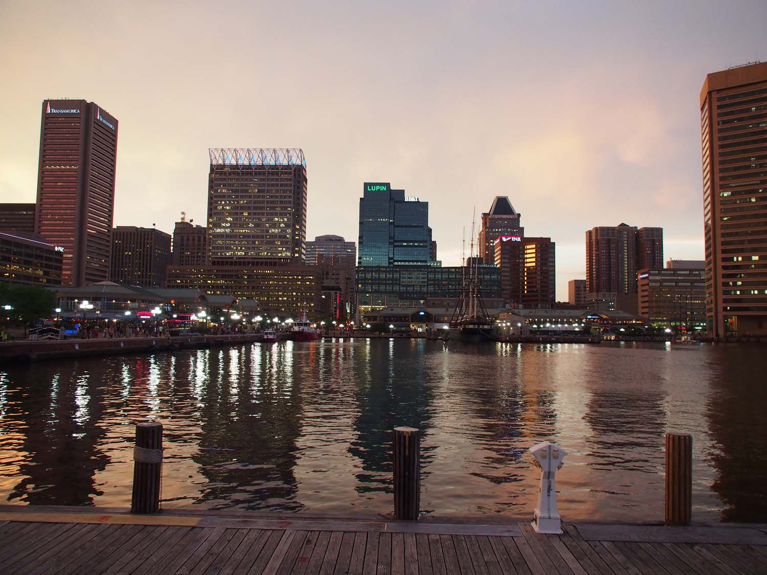 The Inner Harbor from our boat the night before we left. Still many people on the walkway to the left.