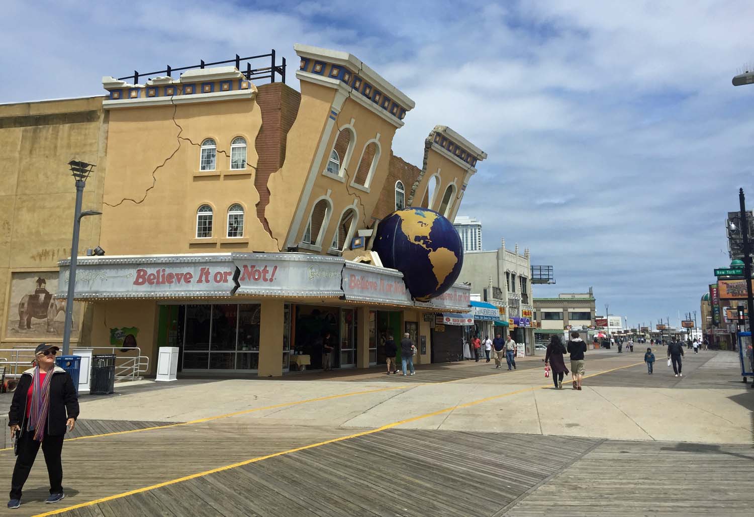 Wednesday we went back downtown to see the famous boardwalk. It was interesting and even the weather became agreeable during our walk. The Steel Pier amusement park at the other end had rides more like those at a portable carnival than a theme park. We have passed more impressive amusement parks along the New Jersey coast. We returned to the “Playground” shopping mall which is three floors on a pier extending off the boardwalk into the Atlantic. It should be an upscale mall since it has an Apple store, and on the 3rd floor has the Atlantic surf showing through big windows all the way out to the end. It must have seen better days but now half the spaces are empty. Maybe the discount malls should be more than a block away?