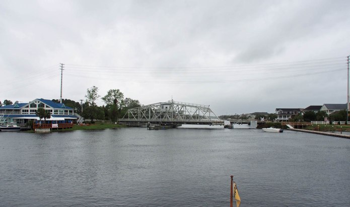 Yesterday (Wednesday) morning the dockmaster in Little River knocked and told us we needed to move to another slip because a large boat was coming in. It was musical boats as the guy in our target slip also needed to move elsewhere. This guy also mentioned that the Socaste bridge was finally opening. This was a surprise to us but we needed to jump on it because the coming storm could just close it down again. A few phone calls to the proper entities confirmed they were opening on demand and a call to the local Coast Guard station got the OK to travel if we stayed on the ICW and kept our wake down. We frantically got everything in order and got a late start out of the marina by 10.