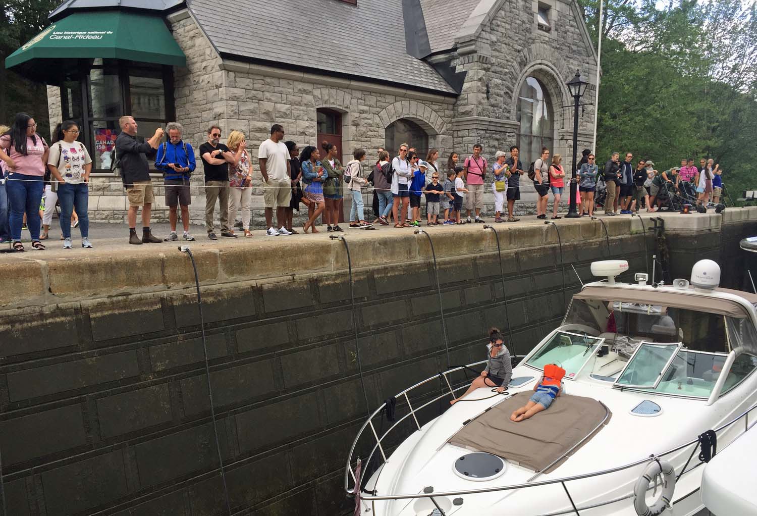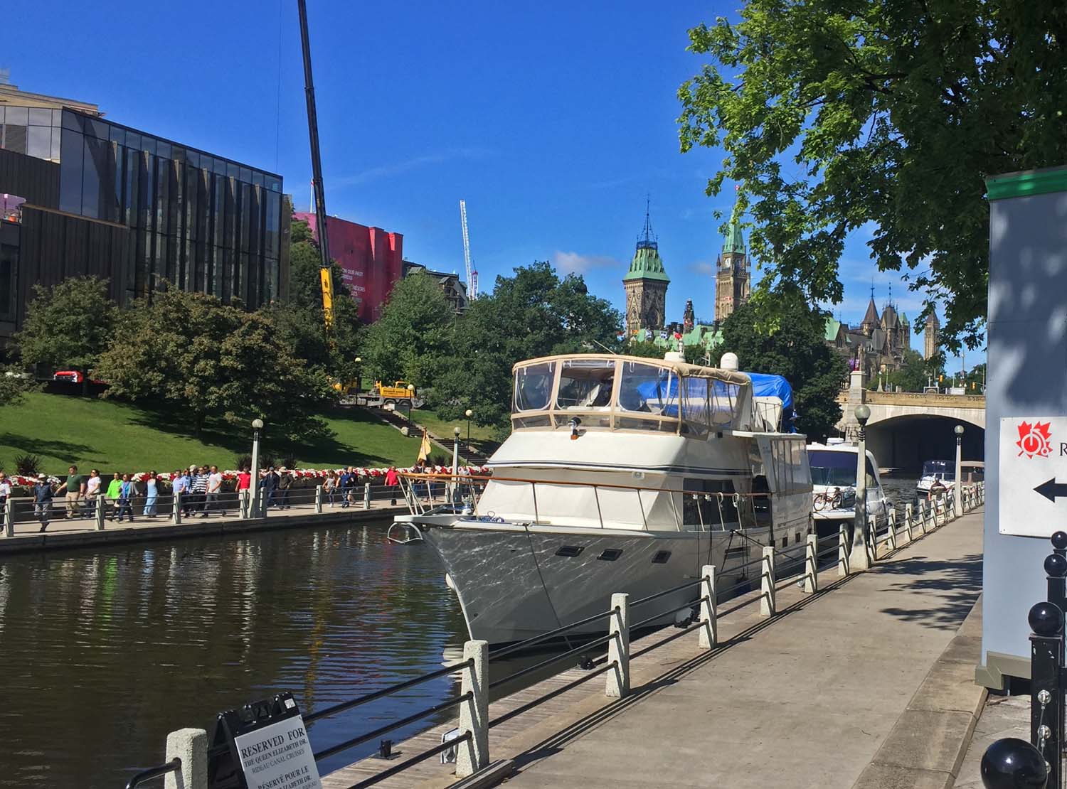 Our parking spot a few hundred feet from the top of the stair step locks. Parliament Hill in the background.